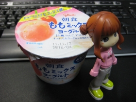 いい気分なコンビニで見つけたヨーグルト。りんご、みかんに続くももミックス。白桃、りんご、アロエだって。