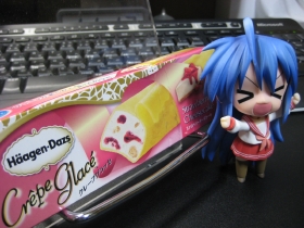 クリスマス仕様のチーズフォンデュ。30%増量ということでムダに長い。気に留めておいたアイテム、その二。売り切れ続出で一時出荷停止になったらしい、お高いアイスのクレープグラッセ、ストロベリーチーズケーキ。
