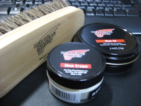 シュークリームとミンクオイル、ブラシ。ブラシは馬毛でイスラエル製。なんだかテンション上がって来るナ。