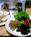 そして冷蔵庫の中のもので夕飯。 もりもり・・・ 本当は納豆ご飯の予定だったのだけど、帰りにパン屋さんで今日だけの限定 桃の蒸しパンを試食したらとてもおいしくて、買ってしまいパン食に変更。