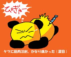 昨日から注射の効果が出たのか果たして自然にかやっと生理が。 110日間も開いてた、間隔。久々だから重いかと思ったら全然痛くもなんとも ない。 で、色々排出が始まったのかお尻にぼこっと大きなおできがっ。 ぎゃすっ。ちょうど注射をしたあたりでかゆいのなんの。しかし場所が場所 でぼりぼりかくわけにもいかない。