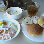 左から:どちらのコースにも付いていたパン・サラダバー・スープバー・ドリンク。どれも食べ放題