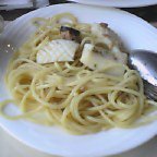 パスタ、あたしはクリームソース・彼氏はトマトソースの大盛(手前の具だらけなのがパスタ)