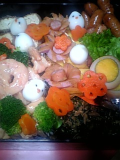 呑む人向けお重の彩の悪さを改善したいところ。 ニンジン飾りは作ってて楽しかった。 緑としてほうれん草のツナ和えを作ったが、当たり前だけどそんなに彩りよくはなかった ブロッコリをもう少し増やすべきか。