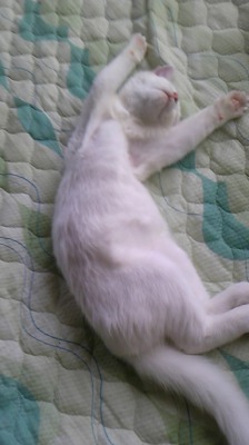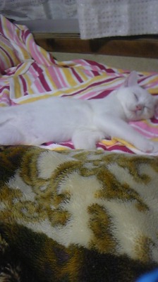 これが確か一ヶ月まえの写真 もうこれの1.5倍です。白い悪魔です。デカイ図体のくせに毛布がないと眠れない。私も毛布がないと眠れないので、二人で暑さでグターっとなりながらも毛布は離さない(笑