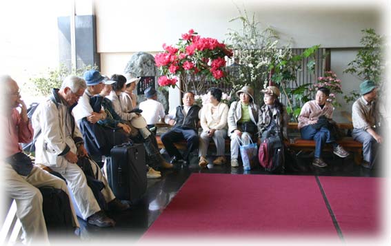 帰りの足、水上駅まで運んでくれるバスを待つホテル玄関先でのメンバーたち。明らかに絵を描く人ではない一般客が2,3人、中央あたりに写っている。