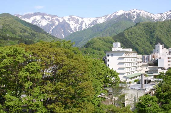 これは翌朝宿泊部屋から見た景色。泊まったホテルは水上館。温泉の湯は透明無色で口にも含んでみたが味は殆どナシ。食事はとても美味しかった。