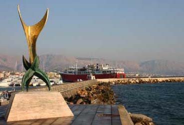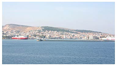 フェリー「HEREUS号」はアテネのピレウスから来る大きな船だ。3階建ての建築物ぐらいはある。出航45分前程に着き、色々作業をしているうちに乗客たちは次々に脇の階段を登る。乗客は80人位はいただろうか。この時期、船内はガラガラだ。幾つかある大きな部屋はどこも空っぽ。船内放送がありセルフサービスの食堂が開くという。私は海からの街の様子をカメラに収めてから少し遅れて入って行ったのだが、食堂にはもう客は殆どいなかった。