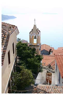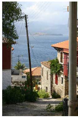 昨日夕方、宿の主人が島のいいところを紹介したいと私をバイクの後ろに乗せ、街からは城壁の裏側にあたるトルコを遠景に見渡す海岸を案内してくれた。 主人は私より少し上の年齢のようだが、矍鑠として歩きバイクをぶんぶん飛ばして若者のようだ。 この地域は一部のガイドブックに載っていたがその通りドライブするにはもってこいのまことに素晴らしい景色だ。リアス式海岸の次々に変わる中に所々に建っている家々がアクセントを添えて情景を作り出す。