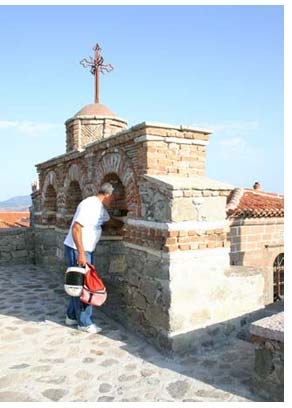 おじさんは古いものが好きらしく私があまり興味のない教会などに連れて行ってくれるのだが、残念ながら今日は日曜日、殆どのそれらの施設は開いていない。彼は非常に残念がった。建物の中にはビザンティン美術の素晴らしいものが沢山入っているようだった。人里離れたずっと山の上にある古い教会にも行ったのだが、そこはとても有名な教会らしくギャラリーには沢山の昔からの書物が陳列されているのがガラス越しに見えた。それらは紙ではなく動物の皮に書かれているのだとのこと。二人の黒い衣装を身にまとった僧侶とおじさんは盛んに話をしていたがギリシア語でこちらにはさっぱり分からず。日曜でギャラリーは見られなかったが、ただ礼拝堂だけは鍵が開いてて中を見られた。図書館本でたまに見るビザンティン画のようなものでぎっしりと埋められていた。