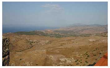 ここバスを乗り換えるために降りたカローニは割合に大きな町で、タクシーは待っているとすぐに掴まった。シグリまでの料金を訊ねた。「35ユーロ」。 予想していたより少し高い答えが返って来たがOKを出した。 そこから目指すシグリまでは約30km。殆どオリーブと雑草がまばらに生えた肌山に近い。くねくねとした山道を走る。島のメイン道路だが山しか見えず変化なくとてつもなく退屈な道だ。昨日はおじさんの案内でカテドラルなどを見ながら回り道をしてそんなに感じなかったが、無口(片言の英語で話にならない)のタクシー運転手とではどうしょうもない、日本車の話などをした後は話題が無くなってしまった。バスの方がどんなに良かったことか。