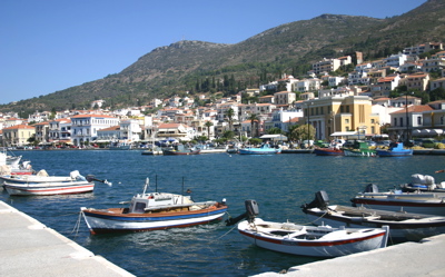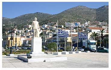 サモス・タウンは非常に奇麗な景観が広がる。真っ白い建物群に殆どが赤い屋根。その中に一つだけ海岸通りの中心に黄色い建物。とてつもなく良く目立つ。後で側を通って見てみるとギリシア国立銀行だった。その他行政の建物だろう、あちこち建物の入口にギリシア国旗が掲げてある。この島は昔ジェノバやベニス、トルコに占拠されていた期間が長いと聞く。美的な建物が多いのはその名残(なごり)か。