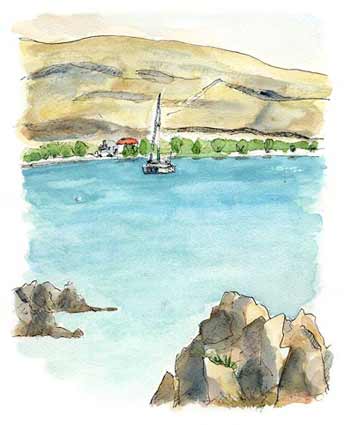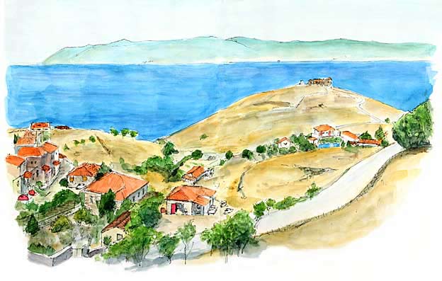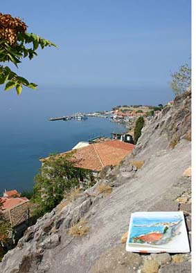 ただ私にとって今日の大きな収穫はレスボス島を島の北側に位置するモリヴォスからずっと南に下り、その間に存るいろんな美しい漁村が見られ、島の概要をつかめたことである。特に島の西南に位置する「シグリ」という町は一目で惚れてしまった。この町に到着するには小高い山の上から降りてくるのだが、初めて見る町全体の幾何学模様─沖にずっと左右に横たわっている島、それにからむように曲線を描く海岸線そして入り込んだ湾、港。そしてたたず むようにマストを降ろして沖に浮かんでいる一艘のヨット。それらはすべて美しい。その側には古い城壁が暗い陰を落とす。