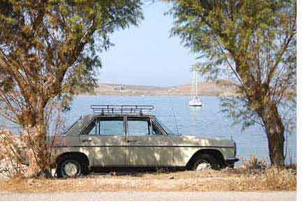 宿では宿のご主人が待っていた。先日約束した島の名所を案内しようと言うのである。私も好奇心でついて行くことにした。 今日は東京─横浜間ぐらいの遠乗りになるという。南の方向にオートバイは走る。 おじさんは風体からして60歳後半だと思うが、軽い車(SUZUKIの100cc?)をブンブンと飛ばし、口には出さなかったがこちらは恐ろしくってしようがない。交通事故を起こして日本人レスボス島で死亡なんて載った新聞記事が頭をかすめた。