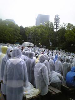 見渡す限り、白いカッパの群れ。顔を上げると雨粒がかかるからみんな下を向き、指先や足元がぬれないように若干背を丸めて直立不動。 もうね、なんの宗教の集会かと。 怖かったわ。
