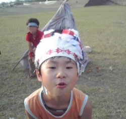 自分達の手作りティピの前のミニラ。 さる?・・・(笑)。