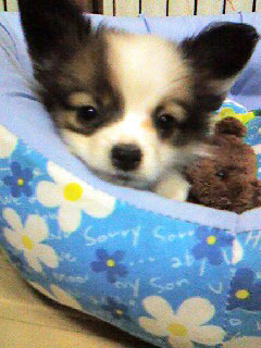 これはルビ子が初めて我が家に来た日の写真。 私がケージの組み立てやら何やらで四苦八苦している最中にミニラが撮ったもの。 ペットショップでもらった小さなベッドのふちにチョコンと顔を乗せて、小さなルビ子はこちらをじっとみていました。