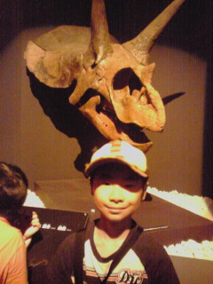 トリケラトプスの前〜〜〜(笑)。 彼の言う恐竜の名前はほとんどわかりませんが。 とにかく恐竜の時代は壮大ね。 想像するだけで楽しい。