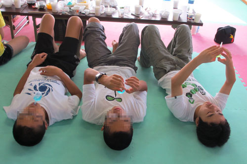 中学生3人、朝食後、ゼリーを食べながら仰向けに。 全くアホだ。
