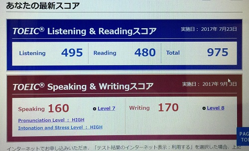 TOEICのS&Wの結果が判明した。 う〜ん、やっぱりねえ、イマイチでしたねえ。 実はS&Wは初めて受検したのですよね。 本人も「戸惑った」と言っていたしねえ。 もっと早くからS&Wも受けさせるべきだったか。 もう遅いけど。