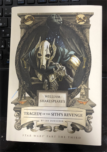 スターウォーズネタです。 息子が注文していた洋書が届いたのでした。 「STARWARS」の脚本をシェイクスピア風に書いたらどうなるかという内容のもので、ラボでシェイクスピアにも親しんでいる息子は、本を読みながら大爆笑。 同じくスターウォーズ好きな友人にセリフが書かれているページを写メして送って、そこでまた2人で大爆笑でした。 これはシリーズ3ですが、全シリーズがシェイクスピア調セリフになって売っているそうです。