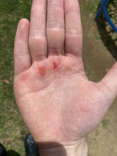 息子は「たまにはいいんじゃない?」と日焼け止めも付けずに出かけ。 途中で「こうなった」と手の皮が剥けた画像を送ってきました。 その他、様々な遊具で遊んでいる図を送ってきたのですが、ほぼほぼ猿。 一応体操をしていただけあって、上り棒的なものは手だけで登れていたり、まあ色々と頑張っているわけですが、心配した通り前腕は日に焼けて真っ赤。 そして手の皮が剥ける。 そこまでやるかね・・・(笑)。
