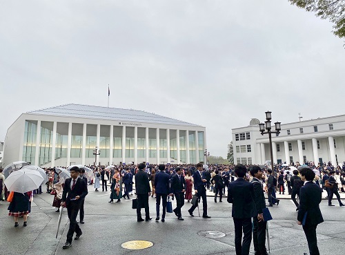 日吉講堂にて大学の卒業式。 まだコロナは続いているし、保護者はオンラインで見る。 そして混雑してしまうからという理由で卒業式の看板は無し。 いやいや・・・ご時世ですな。