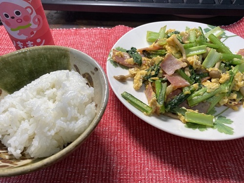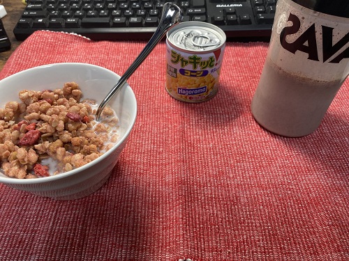 2日続けての飲み(ダーツバー《当然飲む》&教授の追悼式)でさすがに朝ご飯を作る気にもならず、写真のような有様だったらしい。 昼は社食。 まあそういう日もあっていいでしょう。 仕事に差し支えなければ。