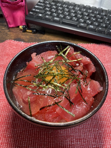 写真は夜「作った」と送られてきた鉄火丼。 しかもちゃんと酢飯にしたそうだ。 やるじゃん、息子。