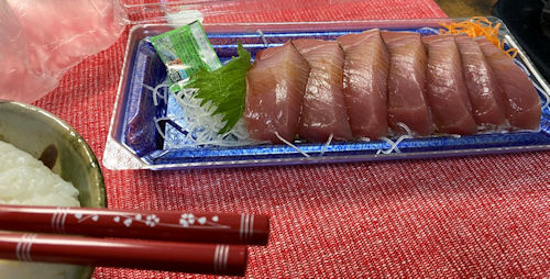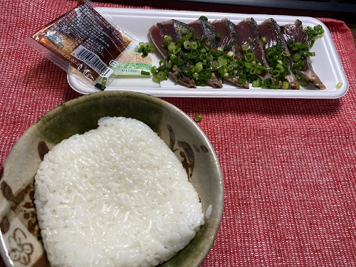 早起きをして疲れたのか「今日はさぼってカツオ」とLineがきた。 カツオのたたきを購入してきて冷凍していたご飯を解凍して晩御飯にしたらしい。 明日からはお弁当も持っていくらしい。