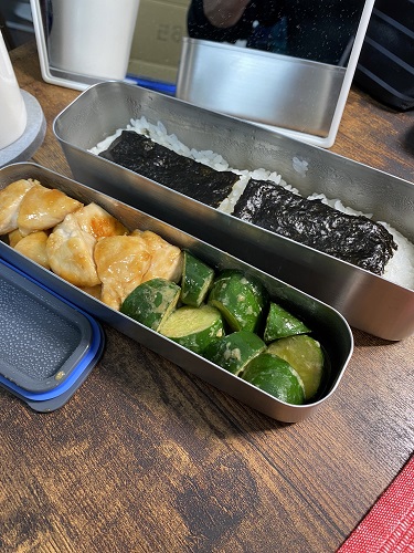 で、画像はお弁当。 なんとかきゅうりを使わなくてはならず、でも生でお弁当に入れるのはリスクが高いというので、色々調べて調理して行ったようです。