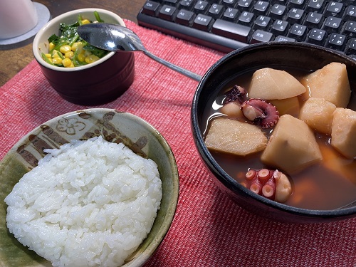 いやいや、自分で里芋とたこの煮込みを作ったらしく。 そしてほうれん草とコーンの炒めもの。 家にいる時より確実に料理の腕は上がり、内容も充実している。