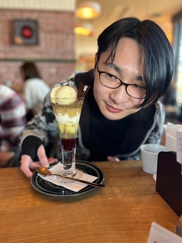 リンゴ狩りの写真は続く。 こんな顔してるのか〜、楽しそうだな。 パフェ好きだしね、息子。 飲むけど甘い物も冷たければ食べるw