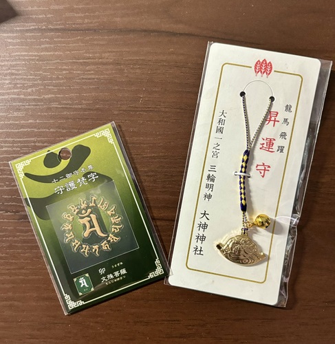 左が興福寺の梵字のお守り。 シールなので、スマホの裏とかに貼るそうだ。 右が大神神社の開運のお守り。 お守りとかってダブっちゃいけないとか言うけれど、寺と神社だから構わないのでは? ってか、息子のためなら何にでも何でも祈るけど。