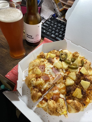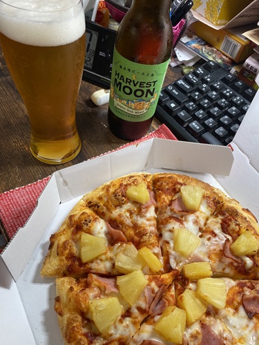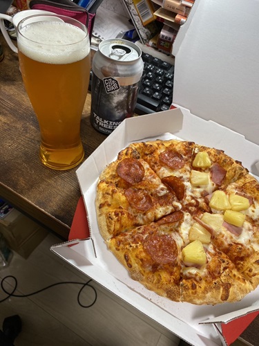 晩御飯はピザにビールだったようだ。 まあピザ(ピッツァと言いたい・・・😢)にはタンパク質も含まれてるし、総合栄養食、ということにしようw