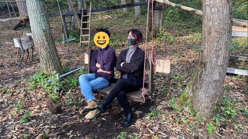 黒姫山の写真を貰った。 総勢12人。 実に楽しそうだ。 その方々のお顔をアップするわけにもいかないので、2歳後輩の子とブランコに乗っている姿を。