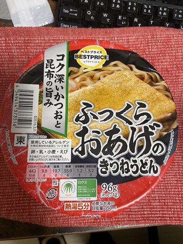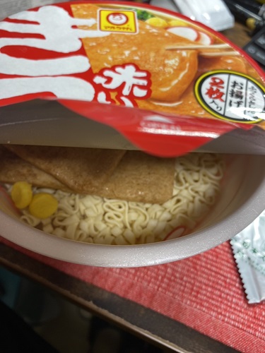 写真は大きいバージョンの赤いきつね。 「なんで?」と聞いたら「炎上してるんだよ。X調べてみ」と言われた。