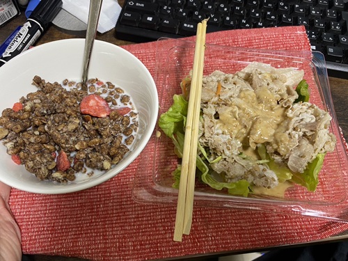 息子の今日の晩御飯。 どうみてもグラノーラにミルクがかかったもの。 そしてコンビニの「サラダ」という名の肉w